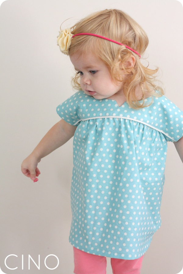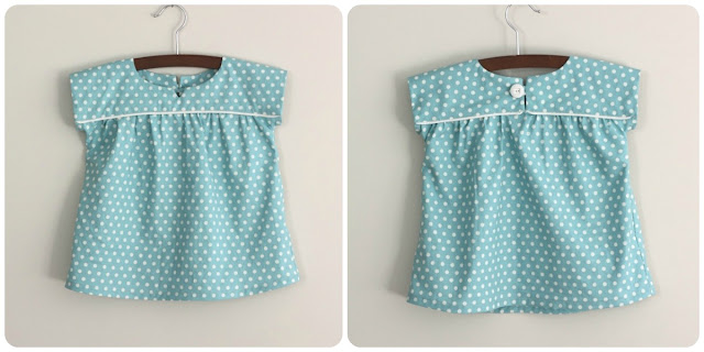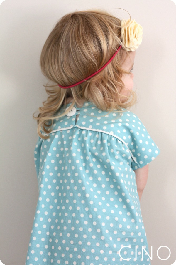 ANYWAYS. I had this blue fabric all cut out for an ice cream dress but didn’t have the right white fabric to match the dots, so it got made into a shirt! I quite like the simplicity of the blue and white dots, and just had to add some piping in the seams! I wish it was smaller piping, but that’s what I had on hand. Again, I made a 2T and while it’s a tad large on her, it’s so cute that I’m glad she can wear it for awhile! It’s not my best work on the back-the piping was tricky to insert smoothly in that seam, and I still don’t know if I’m doing that part right, but it’s wearable!