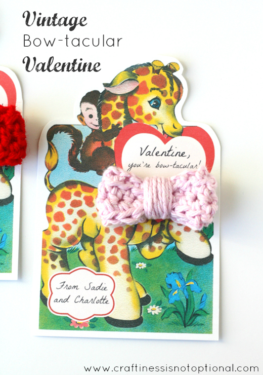 Just as promised, here’s what we handed out to the girls at the party! Again, I found it in this flicker set, and then personalized it and added the label on bottom. I just love the cute little giraffe and monkey! Ok, the greeting is hopelessly cheesy….but all those vintage ones were dripping with cheese. (and some of them kinda suggestive, for kids valentines! yikesabee!) I crocheted up some mini yarn bows and Sadie helped make them into clips, then we attached them to the card by cutting two small slits with an exacto knife (I did that part, obviously), then clipping it on. I heard the girls liked them, hooray!