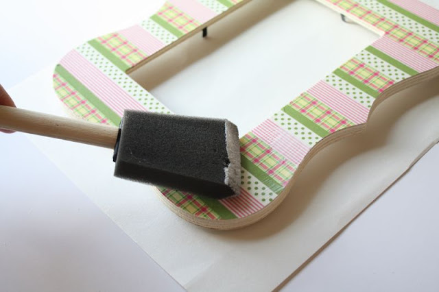 So it’s pretty straight-forward. I first removed the inside part of the frame, then lightly sanded the edges…thought about painting them but I liked the raw wood color with the tapes I used so I left it alone. Then start laying down pieces of washi tape on top of the frame.