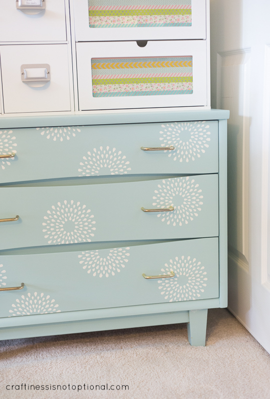 I absolutely ADORE that dresser! I’ve been hunting for a dresser to “upcycle” for our baby’s room and I never thought to use stencils. What an awesome idea! Beautiful!