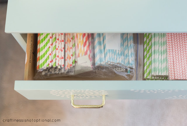 So I’m pretty happy with how it turned out! So much cuter now, and my paper straw collection finally has a home. In the other drawers I keep the kids art supplies that they can play with while in my room, and tissue paper and shipping supplies.