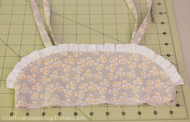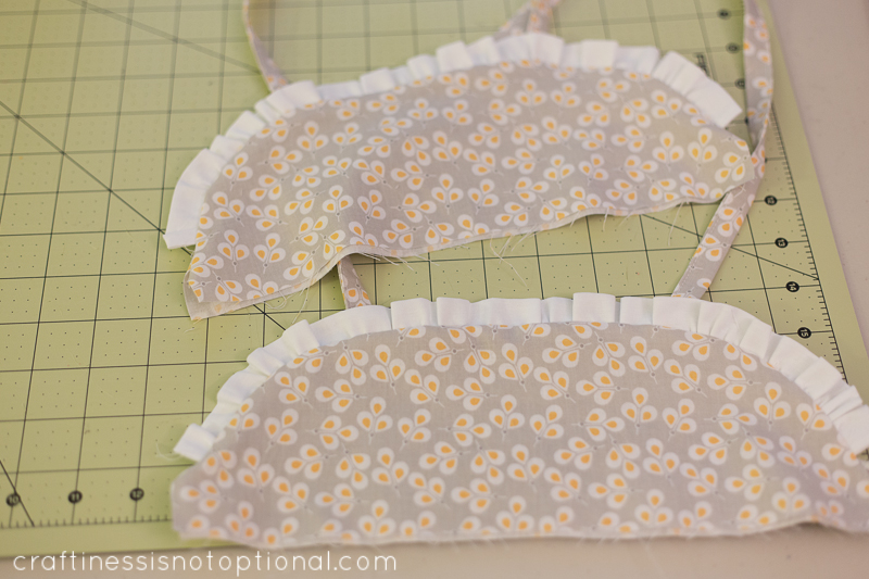 So here’s how I made it! This is a 6-12 mo size, so the straps and ruffle lengths will be for that size, if you are doing a larger size, obviously increase the lengths as needed. Generally ruffle pieces are 1.5 -2 times the width of the fabric they are gathered to fit to.