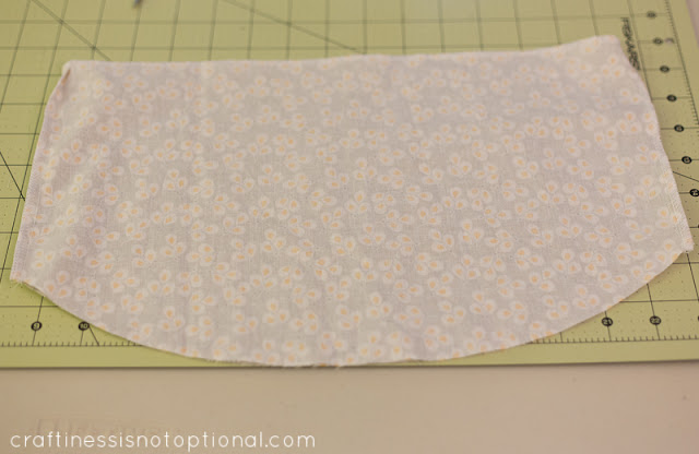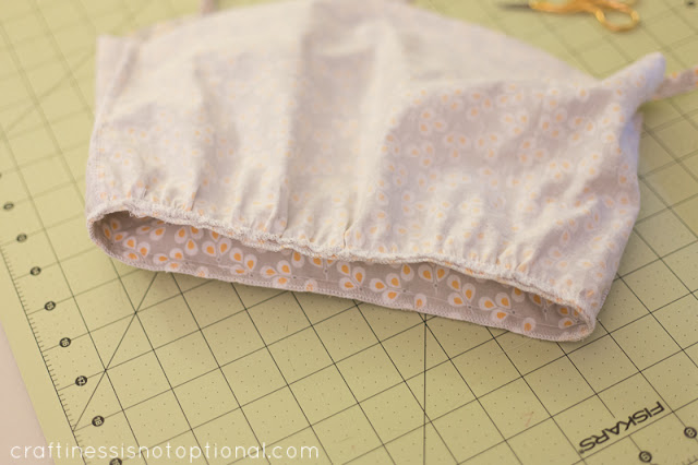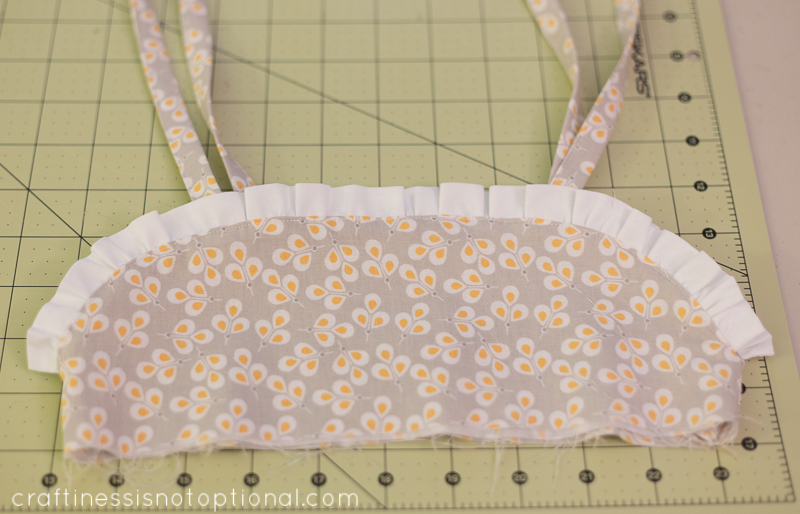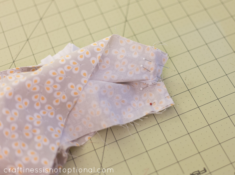 Next pin the straps to the bodice piece and place the other piece on top. I placed mineΒ 2.5″ from either side of the middle of the bodice. (markings will be on the free pattern) Then sew together with a 3/8″ seam.