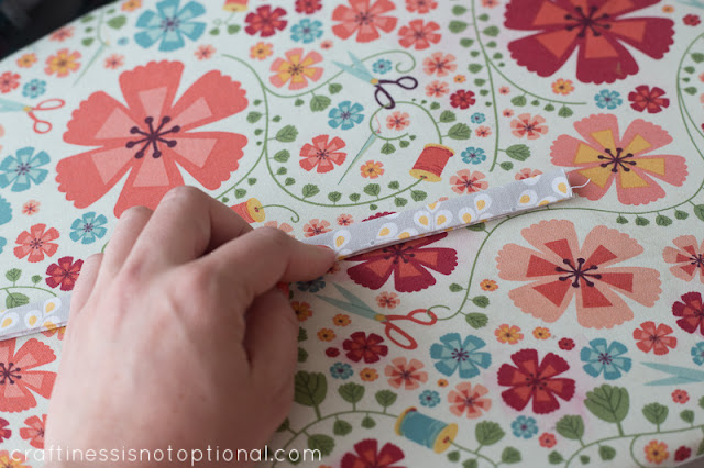 1. Topstitch 1/8″ from the edge. Stop about 6″ from the end or do this next part before you start sewing and pin it. I just did it on the fly!