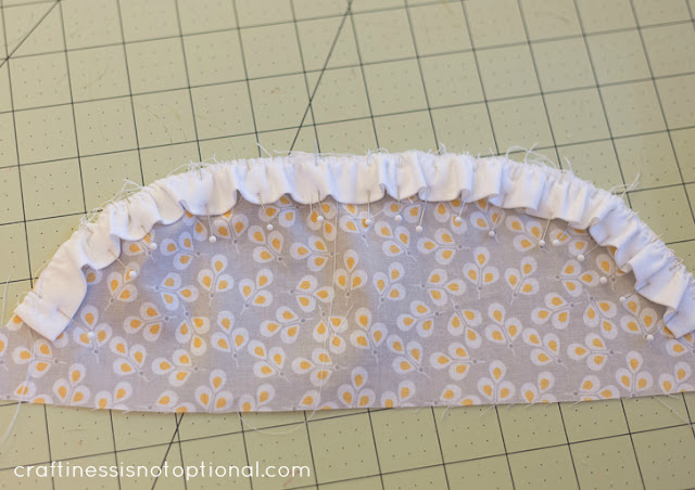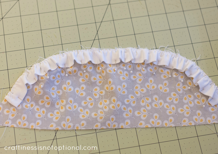 Then sew a gathering stitch along the raw edge of the ruffle and gather to fit a bodice piece. Make sure to leave about 3/4″ to 1″ of space from the end. Baste to the bodice piece 1/8″ from the edge.