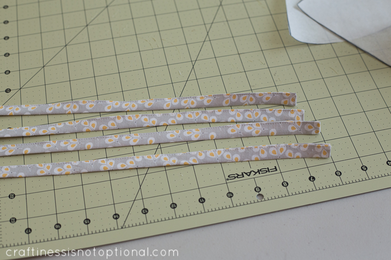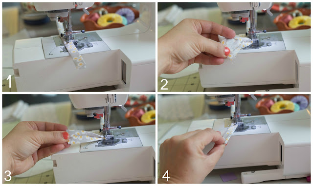 4. and in half again to enclose all raw edges. Continue sewing down the strap and then pivot and sew across the short end, then backstitch to secure.
