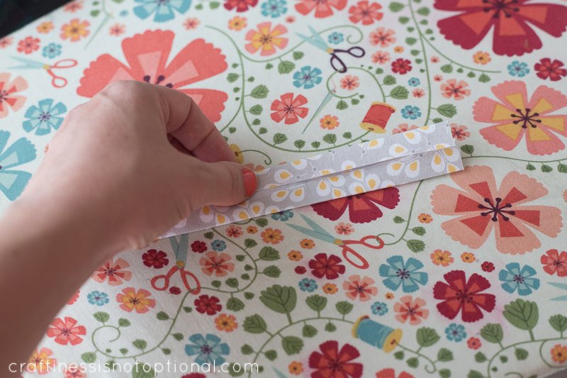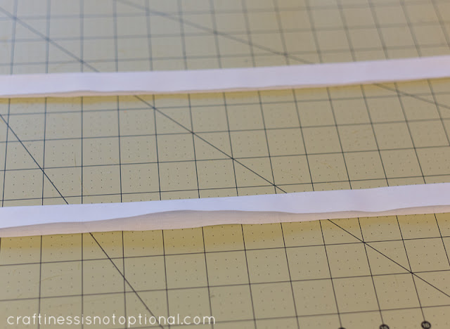 Next press in half with wrong sides together lengthwise, then press each raw edge to the middle like so.