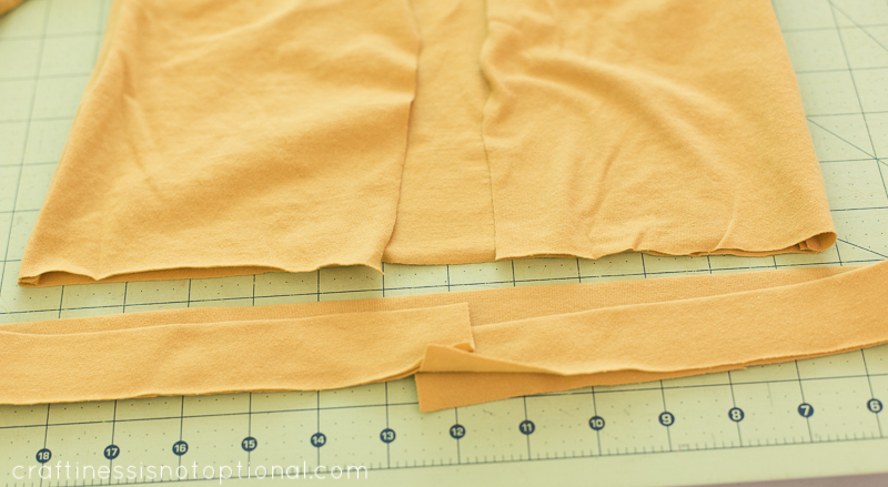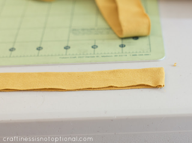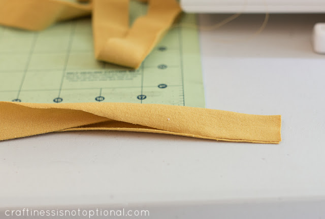 Next, take the wider strip of fabric and press it in half lengthwise, wrong sides facing.