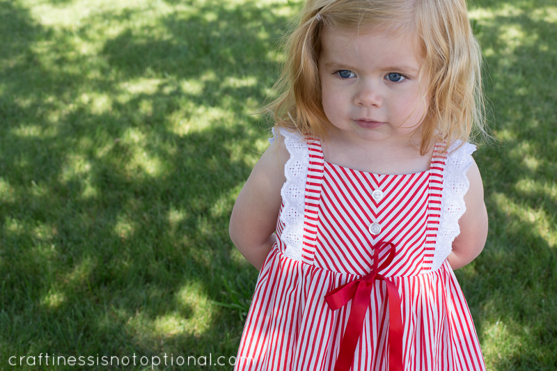 I cut out a size 2 from Adrianna’s pattern, and used her directions to cut the front so the stripes created a chevron look. (I’m telling you…the fates! I swear she added those directions just for me…hehe) I added some eyelet trim instead of the ruffle-love how that turned out! My top stitching on the straps was not my best….that vintage fabric was really squirrely. I’m pretty sure it had some polyester in it.