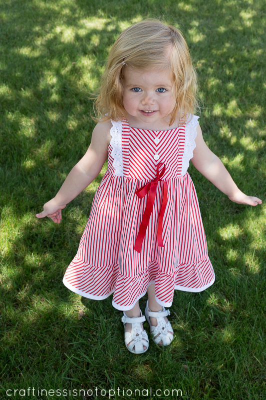 I didn’t get a good shot of the back but it closes with a little button and is really sweet. The Edelweiss dress pattern is really great! Fantastic instructions, very thorough, and the fit was great, although I think my almost 3 year old is getting closer to moving up to a 3T size. Finally!