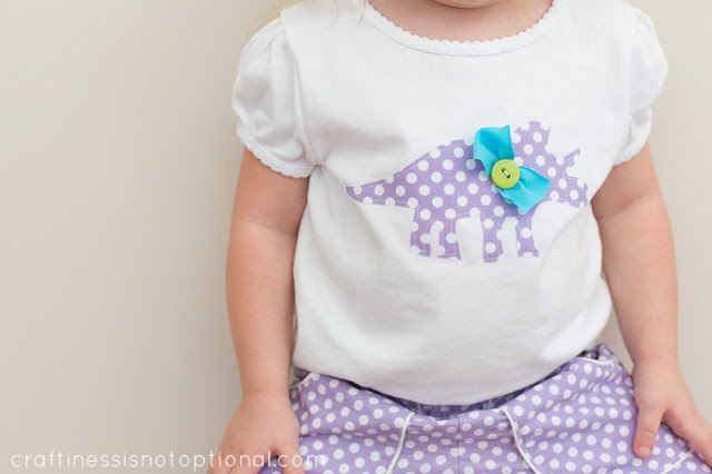 For the shirt, I simply appliqued a dino shape I sketched out on the front of a store bought white tee using heat n’ bond, stitched around the outside, then gathered a little bit of knit fabric to make a bow, sewed that on, then a green button on top. Cute, and girly too!