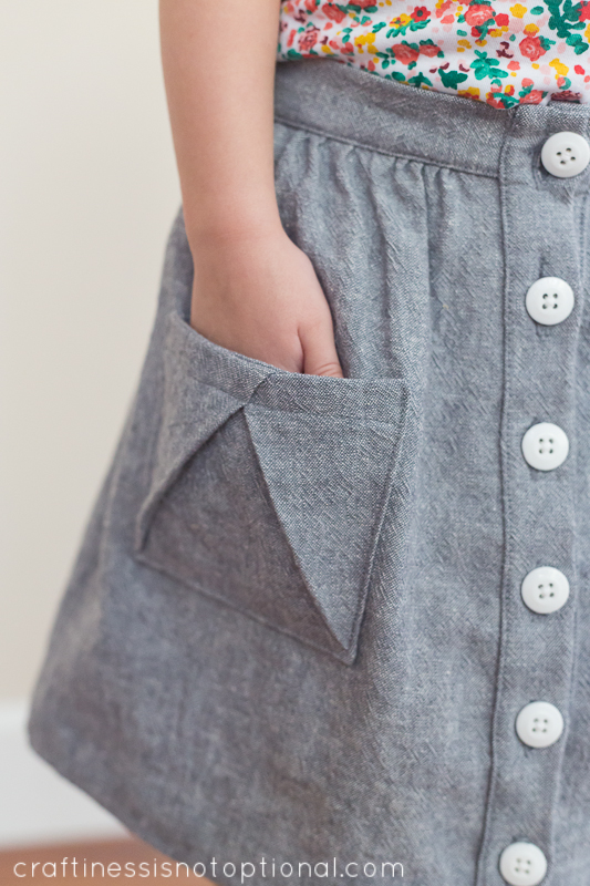It was just safety pinned in place during the photo shoot since I hadn’t had a chance to size it on Sadie. I used some buttery soft grey/blue chambray that I can’t remember where I got….I love the color and it was a dream to sew with. I used some creamy white buttons up the front-I think this skirt will get a lot of use! At least, I hope so-it can go with just about anything, and I think it’d be adorable over some colored tights. Sadie has some teal ones…oh the possibilities!